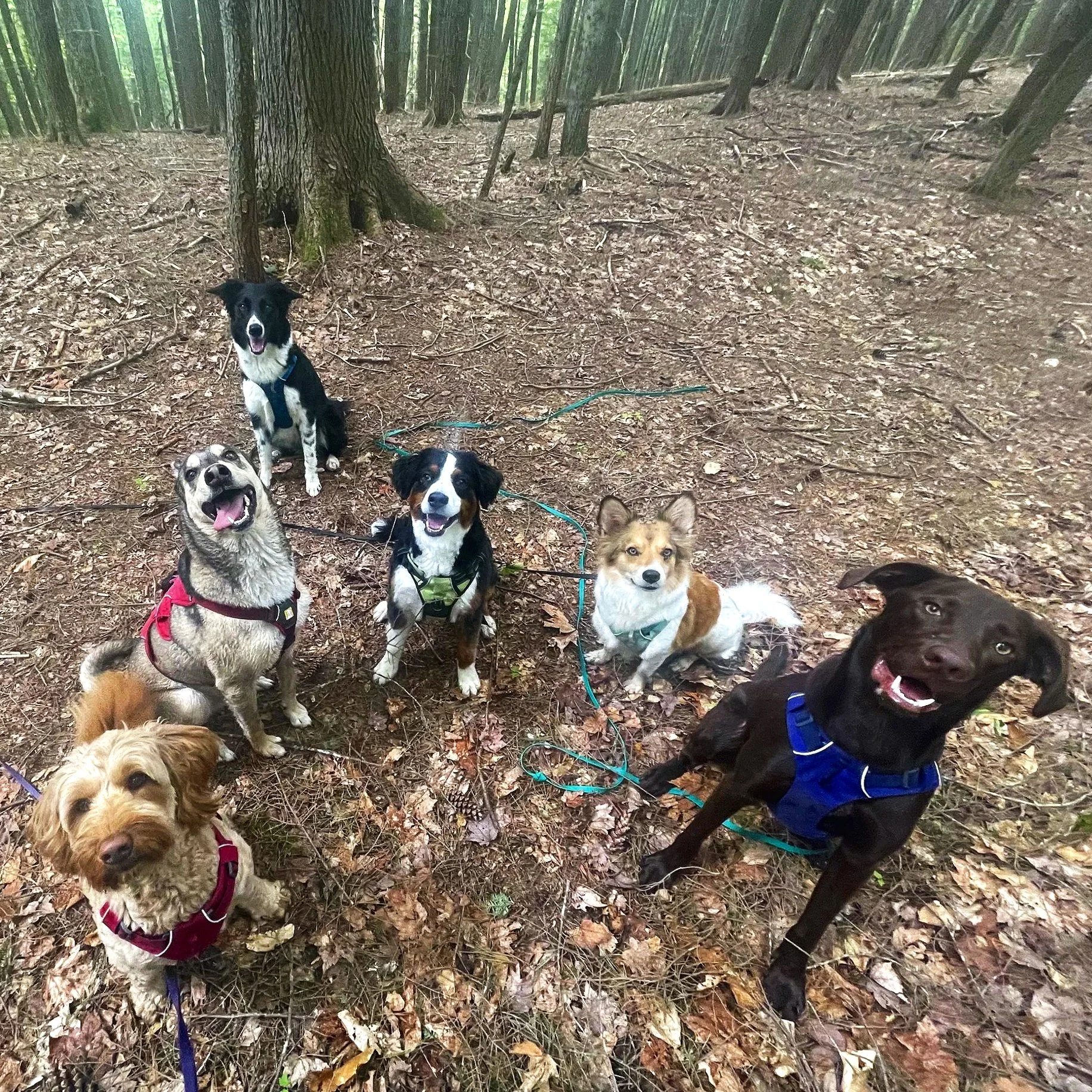 Bottom Left to Right: Hazel, Fox, Piper, Winnie, Broshi, Leo out on a group social hike